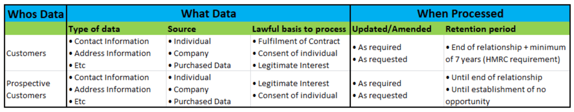 The existing customer data that we process is done so under a combination of the “fulfilment of contract”, “consent of the individual” and “legitimate interest”. Prospective customers’ data is processed by either “consent of the individual” or “legitimate interest”.